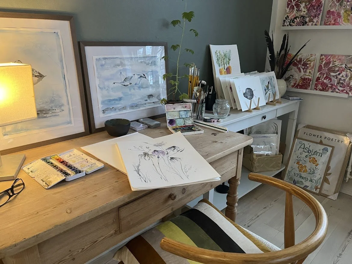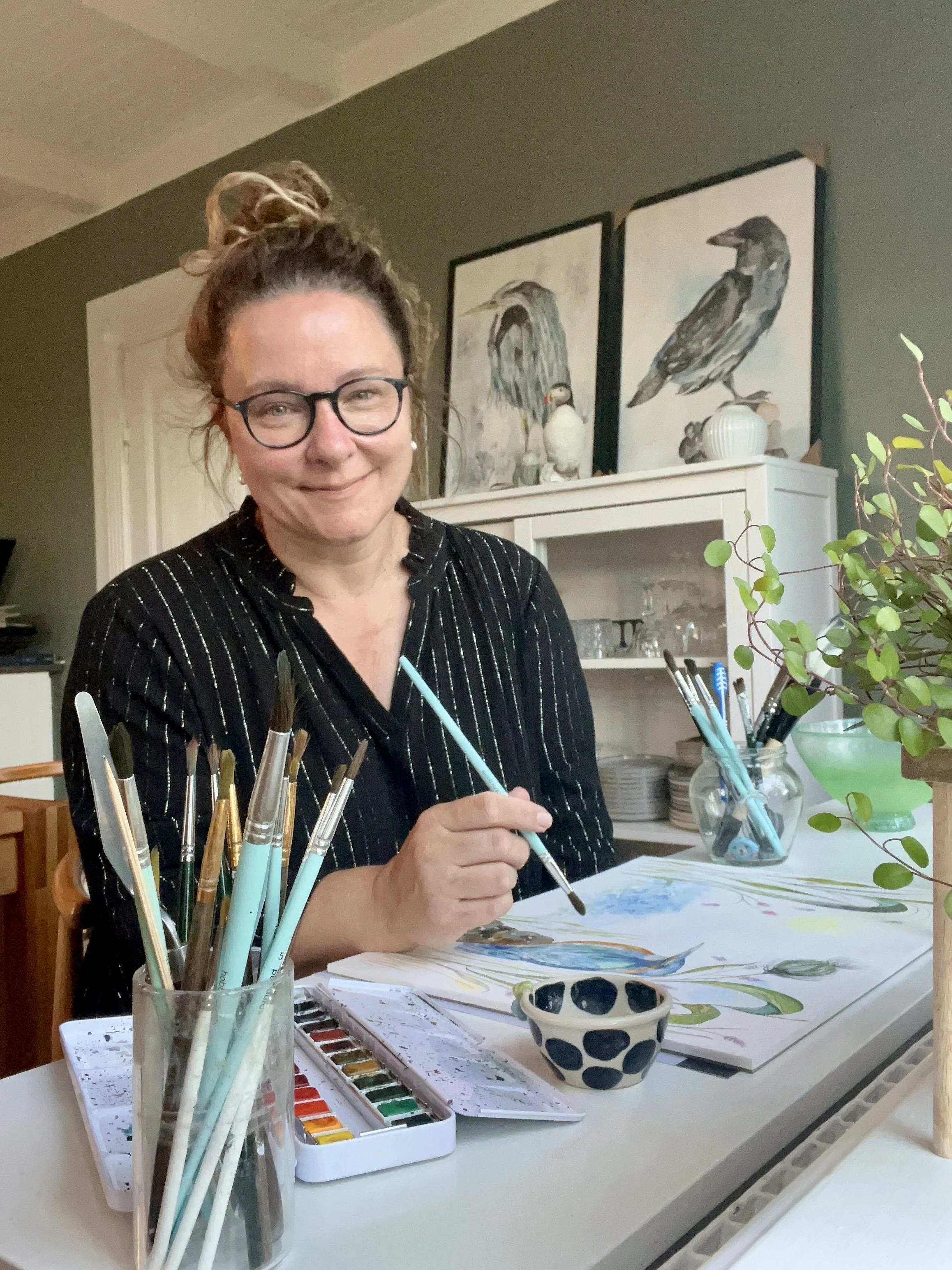 Jeg arbejder i nuancer af blå og grøn og begynder altid med baggrunden. Først skabes et farverum – en stemning af natur, lys og ro – og derefter træder fuglen frem i det.